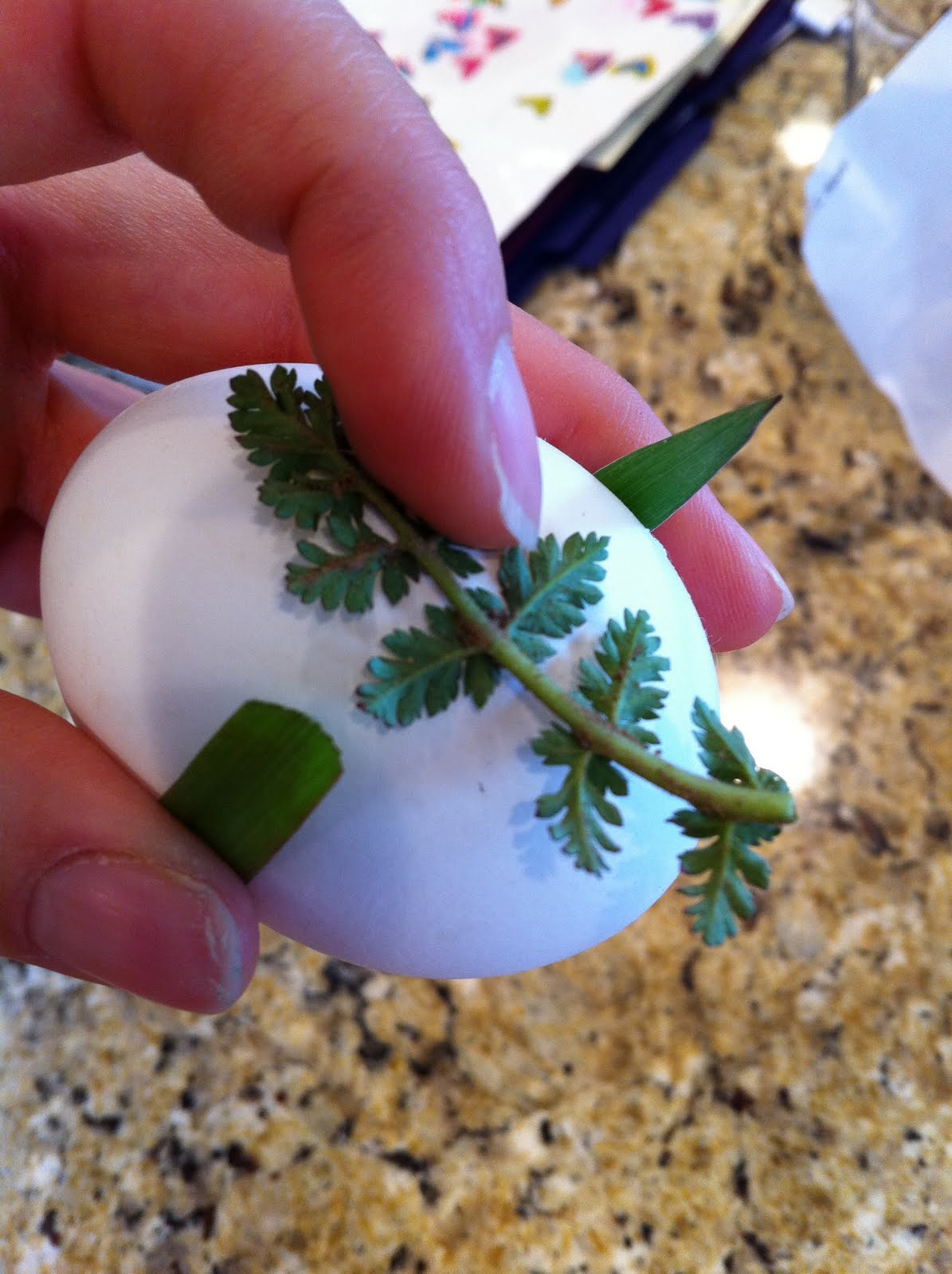 We went out into the backyard on the look out for interesting shaped leaves. We found weeds. That'll work! We pulled a few of them and brought them in the kitchen with our hardboiled eggs.